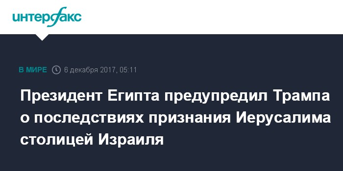 Москва. 6 декабря. INTERFAX.RU - Президент Египта Абдель Фаттах ас-Сиси заявил президенту США Дональду Трампу, что решение о переносе посольства США в Израиле из Тель-Авива в Иерусалим может подорвать основу для ближневосточного мирного урегулирования, сообщил в среду офис главы государства.