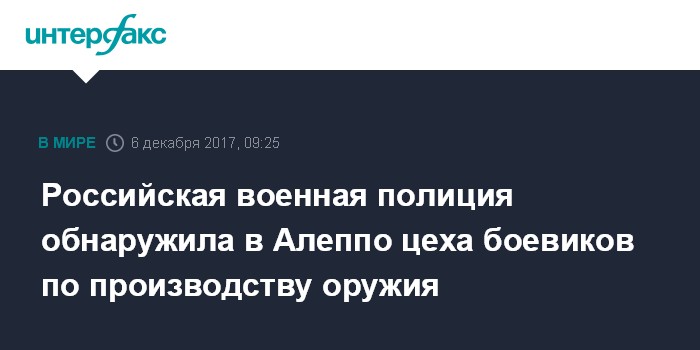 Москва. 6 декабря. INTERFAX.RU - Российская военная полиция обнаружила цеха боевиков террористической группировки "Исламское государство" (ИГ, запрещена в России) по производству оружия в районе Сахур в сирийском Алеппо.