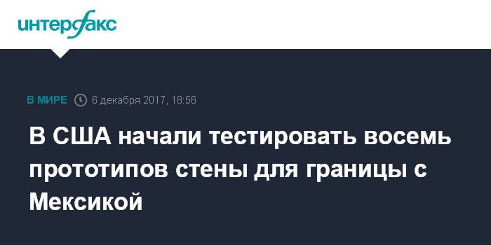Москва. 6 декабря. INTERFAX.RU - Служба таможенного и пограничного контроля США приступила к тестированию прототипов стены, которую планируется построить на границе с Мексикой, передает в среду телеканал ABC.