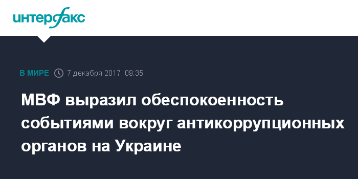 Москва. 7 декабря. INTERFAX.RU - Международный валютный фонд (МВФ) выразил опасение, что достигнутая независимость антикоррупционных органов на Украине может быть поставлена под вопрос.