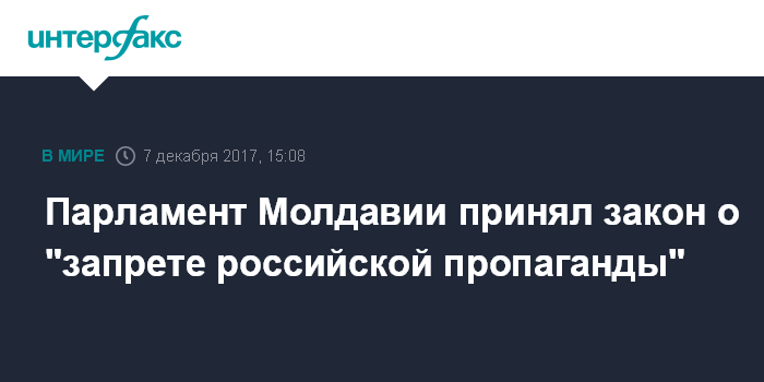 Москва. 7 декабря. INTERFAX.RU - Парламент Молдавии в четверг принял сразу в двух чтениях закон о "запрете российской пропаганды". Он был включен в повестку дня парламента по настоянию фракции правящей в Молдавии Демократической партии.