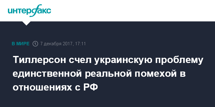 Москва. 7 декабря. INTERFAX.RU - Проблема Украины - единственное серьезное препятствие для нормализации отношений США и РФ, заявил в четверг госсекретарь США Рекс Тиллерсон.