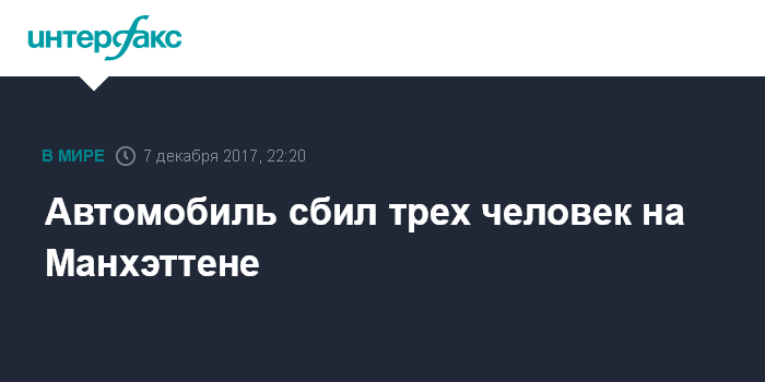 Москва. 7 декабря. INTERFAX.RU - Автомобиль сбил как минимум трех человек в районе Манхэттена, сообщает в четверг телеканал NBC. Источник в правоохранительных органах рассказал телеканалу, что, скорее всего, речь идет о несчастном случае, не имеющем отношения к терроризму. Сбитые машиной люди получили травмы, погибших нет.