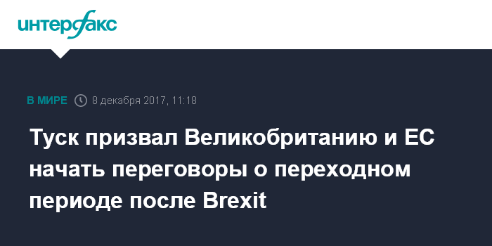 Москва. 8 декабря. INTERFAX.RU - Председатель Европейского совета Дональд Туск в пятницу на пресс-конференции в Брюсселе призвал Великобританию, а также представителей стран ЕС начать обсуждение переходного периода после Brexit.