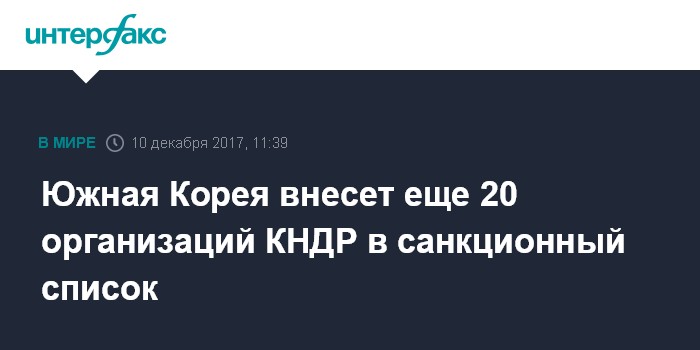 Москва. 10 декабря. INTERFAX.RU - Южнокорейские власти планируют ввести дополнительные ограничительные меры в отношении еще 20 организаций и 12 физических лиц из КНДР, передает в воскресенье агентство "Ренхап" со ссылкой на неназванный источник в МИД Южной Кореи.