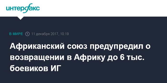 Москва. 11 декабря. INTERFAX.RU - До шести тысяч африканских боевиков, воевавших на стороне "Исламского государства" (ИГ, запрещенная в РФ террористическая группировка) в Сирии и Ираке, могут вернуться в Африку, заявил комиссар по вопросам мира и безопасности Африканского союза Смаил Шерги.