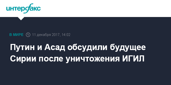 "Тема нашей встречи - уничтожение боевиков ИГИЛ - очень важна для всего мира. Мы справились с этим. От имени всего народа САР выражаю глубокую признательность за ту роль, которую сыграли ваши вооружённые силы. Победы, которые достигнуты, коснулись не только нашего государства, но и соседних стран", - сказал Асад.