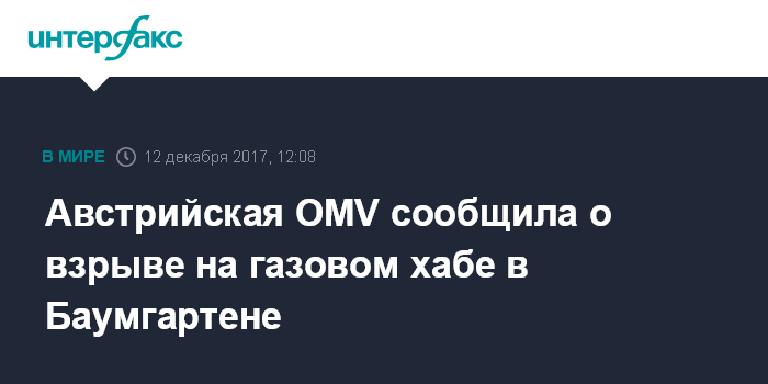 Москва. 12 декабря. INTERFAX.RU - Австрийская компания OMV сообщила о взрыве на центрально-европейском газовом хабе в Баумгартене.