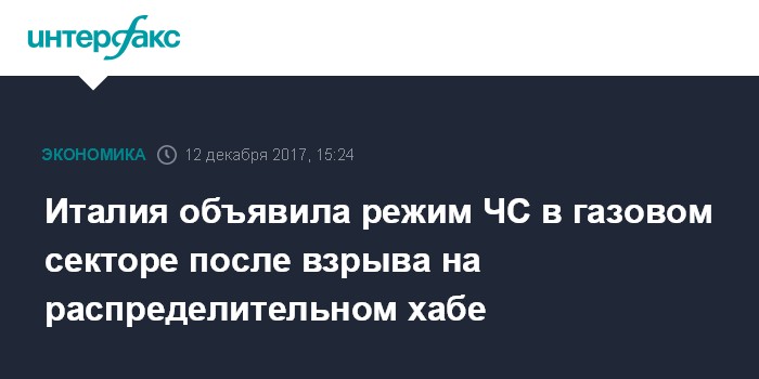 Москва. 12 декабря. INTERFAX.RU - Италия объявила о режиме чрезвычайной ситуации в газовом секторе из-за инцидента на газовом хабе, заявил министр экономического развития страны Карло Календа.