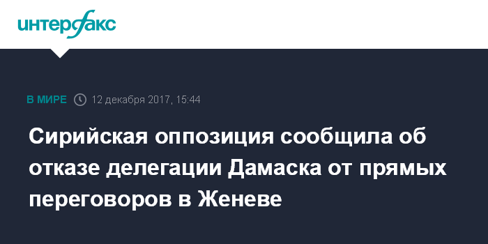 Официальный представитель оппозиционной Сирийской комиссии по переговорам Яхъя аль-Ариди сказал, что представители правительственной делегации якобы заявили специальному посланнику ООН Стаффану де Мистуре об отказе от прямых переговоров и настаивают на контактах в Женеве через посредника.