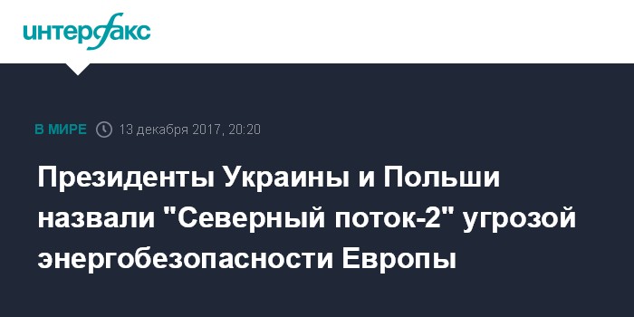 "Позиция Польши по вопросу "Северного потока-2" неизменна. Мы абсолютно против этой инвестиции, мы считаем, что она попирает европейские нормы, что она против интересов Европейского союза, и тут наши позиции (с Украиной - ИФ) с самого начала однозначны, идентичны и неизменны", - сказал Дуда в среду на совместном брифинге с президентом Украины Петром Порошенко в Харькове.