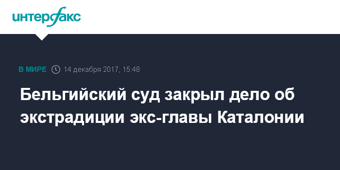 Москва. 14 декабря. INTERFAX.RU - Бельгийский суд официально объявил о закрытии дела об экстрадиции бывшего главы каталонского правительства Карлеса Пучдемона в Испанию, сообщает в четверг газета La Vanguardia.