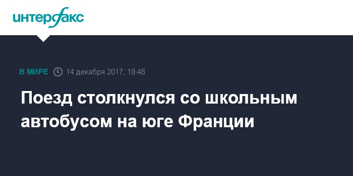Москва. 14 декабря. INTERFAX.RU - Два человека погибли, семь получили травмы в результате столкновения поезда со школьным автобусом во Франции, передает в четверг радиостанция France Info.
