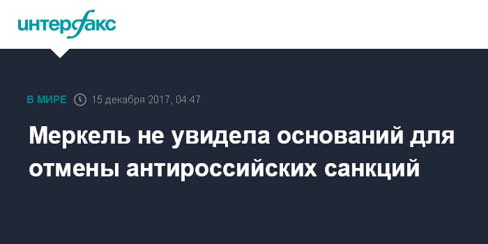 Москва. 15 декабря. INTERFAX.RU - Канцлер ФРГ Ангела Меркель заявила в пятницу, что Евросоюз не нашел достаточных оснований для отмены антироссийских санкций.