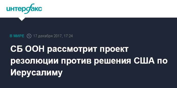 Москва. 17 декабря. INTERFAX.RU - Вопрос об одностороннем изменении США статуса Иерусалима будет рассмотрен на заседании Совета безопасности ООН, сообщает в воскресенье Анатолийское агентство новостей.