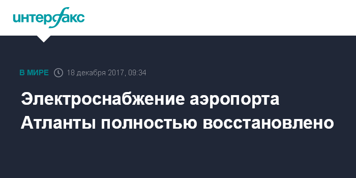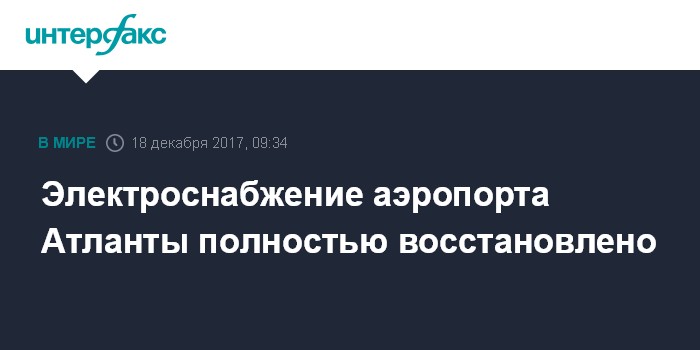 Москва. 18 декабря. INTERFAX.RU - Подача электроэнергии в международный аэропорт Хартсфилд-Джексон в Атланте (штат Джорджия, США) полностью восстановлена, сообщает в понедельник агентство Associated Press.