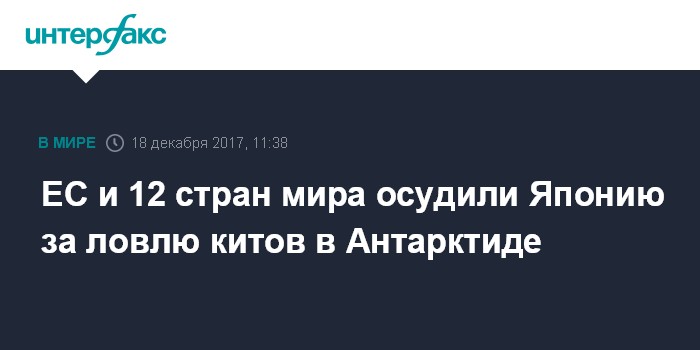 Москва. 18 декабря. INTERFAX.RU - ЕС и 12 стран мира обнародовали заявление, в котором подвергли критике деятельность японских китобоев в районе Антарктиды, которые, по версии Токио, ловят китов в научно-исследовательских целях. Об этом сообщают в понедельник западные СМИ со ссылкой на текст заявления.