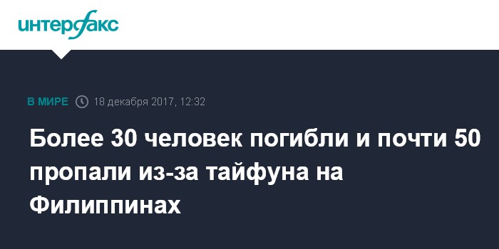 Москва. 18 декабря. INTERFAX.RU - Число жертв тайфуна Урдуджа, обрушившегося в выходные на Филиппины, превысило 30 человек, пропавших без вести - приближается к 50, сообщает в понедельник газета Manila Bulletin.