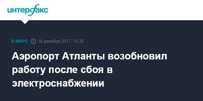 Москва. 18 декабря. INTERFAX.RU - Международный аэропорт Хартсфилд-Джексон в городе Атланта (штат Джорджия, США) возобновил работу в понедельник утром после того, как ранее этот аэропорт был обесточен, сообщает Associated Press.