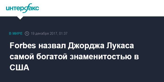 Москва. 19 декабря. INTERFAX.RU - Режиссер и продюсер Джордж Лукас стал самой богатой американской знаменитостью в рейтинге журнала Forbes: его состояние в 2017 году составило $5,5 млрд.