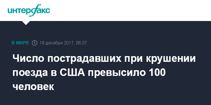 Москва. 19 декабря. INTERFAX.RU - Больше ста человек пострадали при крушении скоростного поезда в штате Вашингтон, США, сообщает в понедельник CNN. У четырех из них серьезные травмы.