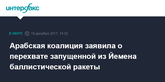 Москва. 19 декабря. INTERFAX.RU - Возглавляемая Саудовской Аравией коалиция сообщила об успешном перехвате баллистической ракеты, которая была выпущена повстанцами из Йемена в сторону Эр-Рияда, передает во вторник межарабский телеканал "Аль-Арабийя".