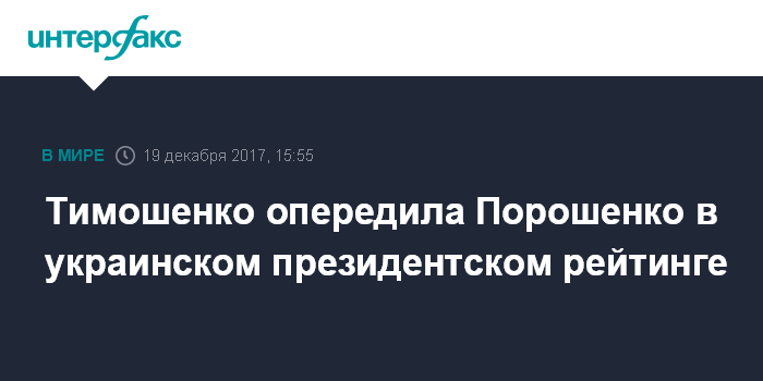 Москва. 19 декабря. INTERFAX.RU - Украинцы поддержали бы на президентских выборах лидера партии "Батькивщина" Юлию Тимошенко, в тройке лидеров также действующий глава государства Петр Порошенко и лидер партии "Гражданская позиция" Анатолий Гриценко, о чем свидетельствуют данные опроса Киевского международного института социологии (КМИС).