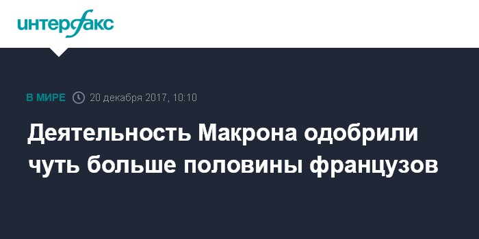 Москва. 20 декабря. INTERFAX.RU - Рейтинг одобрения деятельности президента Франции Эммануэля Макрона составляет 52%, свидетельствуют результаты опроса, опубликованного в среду компанией BVA.