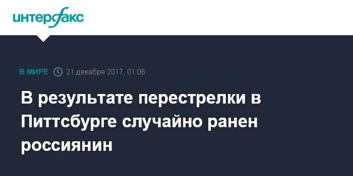Москва. 21 декабря. INTERFAX.RU - Россиянин был случайно ранен в результате перестрелки в американском городе Питтсбург, ему оказывается необходимое содействие со стороны генерального консульства РФ в Нью-Йорке.
