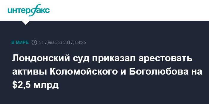 Москва. 21 декабря. INTERFAX.RU - Высокий суд Лондона издал приказ об аресте активов бывших владельцев украинского Приватбанка Игоря Коломойского и Геннадия Боголюбова на более чем $2,5 млрд.