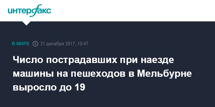Москва. 21 декабря. INTERFAX.RU - Число пострадавших в результате наезда автомобиля на пешеходов в центре Мельбурна возросло до 19 человек, сообщает в четверг агентство AP со ссылкой на данные австралийской полиции.