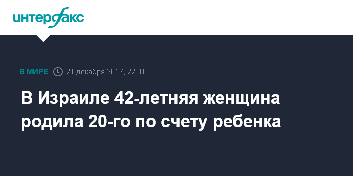 Москва. 21 декабря. INTERFAX.RU - В израильской столице у 42-летней женщины родился сын, ставший ее 20-м по счету ребенком, пишет в четверг газета Jerusalem Post.