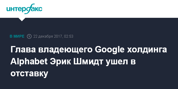 Москва. 22 декабря. INTERFAX.RU - Председатель совета директоров холдинга Alphabet, которому принадлежит компания Google Inc., - Эрик Шмидт - в пятницу заявил о своей отставке.
