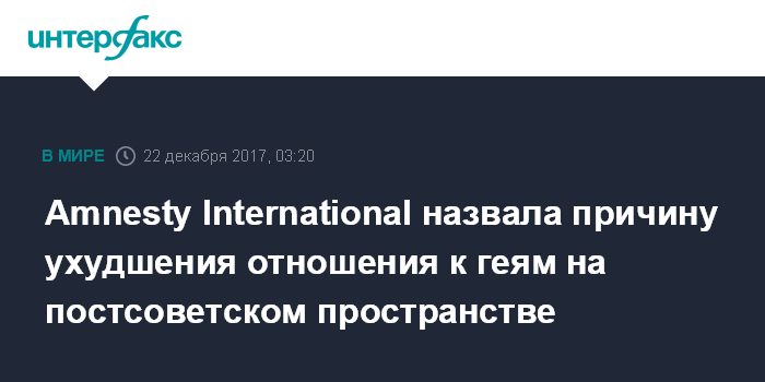 Москва. 22 декабря. INTERFAX.RU - Российская кампания против "нетрадиционных сексуальных отношений" способствовала росту враждебности по отношению к сексуальным меньшинствам (ЛГБТИ - лесбиянки, геи, бисексуалы, трансгендеры, интерсексуалы) в постсоветских странах, говорится в докладе международной правозащитной организации Amnesty International.