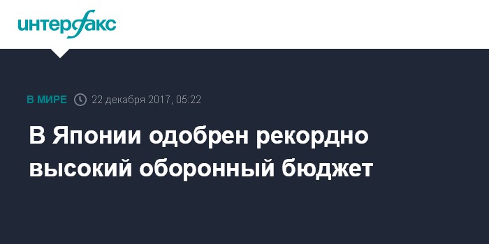 Москва. 22 декабря. INTERFAX.RU - Премьер-министр Японии Синдзо Абэ одобрил в пятницу оборонный бюджет страны на 2018 год в размере 5,19 трлн иен ($46 млрд), который на 1,3% превышает выделенные на оборону расходы в 2017 году, сообщило агентство Associated Press из Токио.