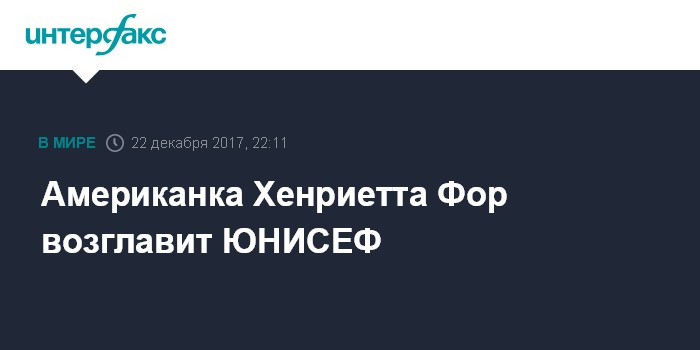 Москва. 22 декабря. INTERFAX.RU - Хенриетта Фор сменит на посту нынешнего главу Детского фонда ООН (ЮНИСЕФ) Энтони Лейка, говорится в пресс-релизе, распространенном в пятницу на официальном веб-сайте фонда.