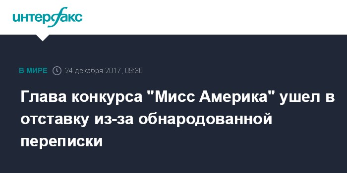 Москва. 24 декабря. INTERFAX.RU - Руководитель конкурса "Мисс Америка" Сэм Хаскелл подал в отставку со своего поста, после того как оказалась обнародована переписка, в которой он позволял себе нелицеприятные комментарии в адрес бывших и действующих участниц.