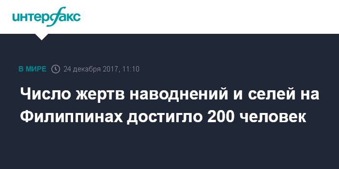 Москва. 24 декабря. INTERFAX.RU - В результате наводнений и схода селей на юге Филиппин погибли 200 человек, около 70 тыс. человек были эвакуированы из опасных районов, пропавшими без вести числятся более 140 человек, сообщили местные власти.