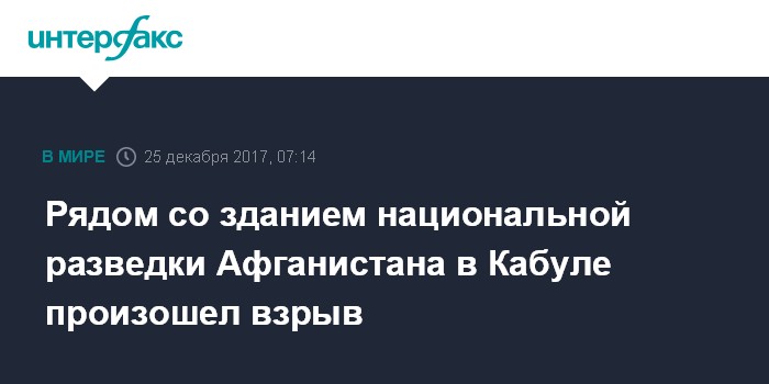 Москва. 25 декабря. INTERFAX.RU - Взрыв произошел рядом с комплексом национальной разведки Афганистана в Кабуле в понедельник, сообщили власти.