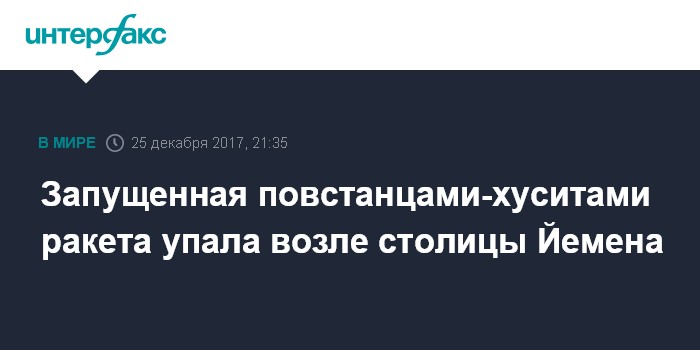 Москва. 25 декабря. INTERFAX.RU - Йеменские повстанцы-хуситы осуществили неудачный пуск боевой ракеты со своих позиций около столицы Йемена Саны. Об этом сообщает в понедельник телеканал Al Arabiya.