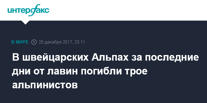 Москва. 25 декабря. INTERFAX.RU - Трое альпинистов стали жертвами схода лавин в швейцарских Альпах за последние три дня, сообщают в понедельник западные СМИ со ссылкой на местную полицию.