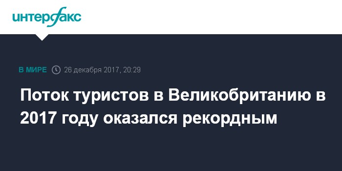 Москва. 26 декабря. INTERFAX.RU - Поток иностранных туристов в Великобританию в 2018 году впервые превысит 40 млн человек, а их расходы достигнут рекордных 27 млрд фунтов стерлингов ($36 млрд), прогнозирует агентство VisitBritain.