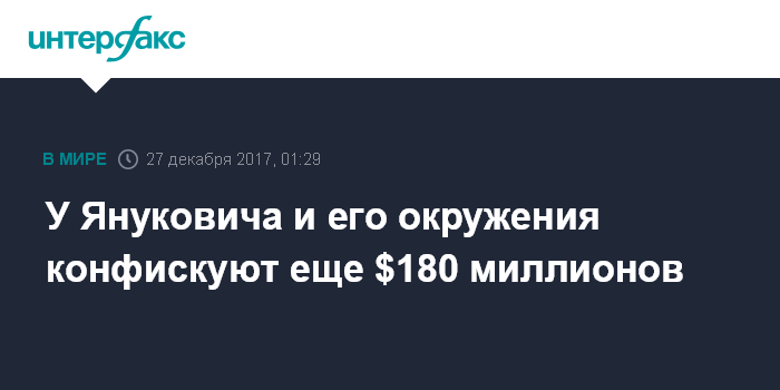 Москва. 27 декабря. INTERFAX.RU - Генеральный прокурор Украины Юрий Луценко анонсировал конфискацию в начале 2018 года еще 5 млрд грн (около $180 млн по нынешнему курсу) экс-президента Украины Виктора Януковича и его окружения.