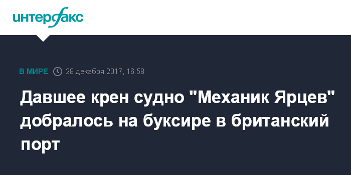 Москва. 28 декабря. INTERFAX.RU - Российское грузовое судно "Механик Ярцев", давшее на этой неделе сильный крен, в четверг прибыло на буксире к порту британского города Саутгемптон, свидетельствуют данные международной Автоматической идентификационной системы (AIS).