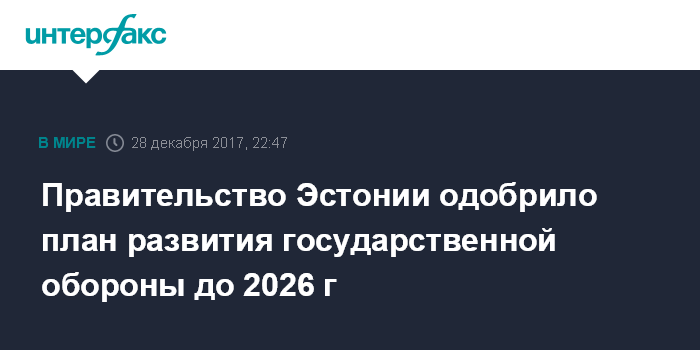 Москва. 28 декабря. INTERFAX.RU - Прикладной план развития государственной обороны на период до 2026 г. одобрило правительство Эстонии в четверг, сообщили агентству BNS в пресс-службе правительства.