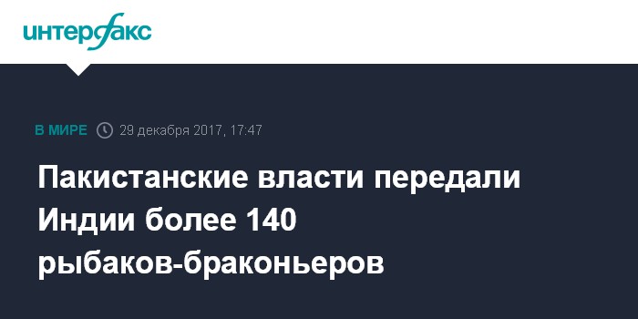 Москва. 29 декабря. INTERFAX.RU - Пакистан передал Индии 145 индийских рыбаков, которые ранее были задержаны пакистанскими властями и отправлены в тюрьму за незаконный рыболовный промысел в водах Пакистана, передает в пятницу агентство АР.