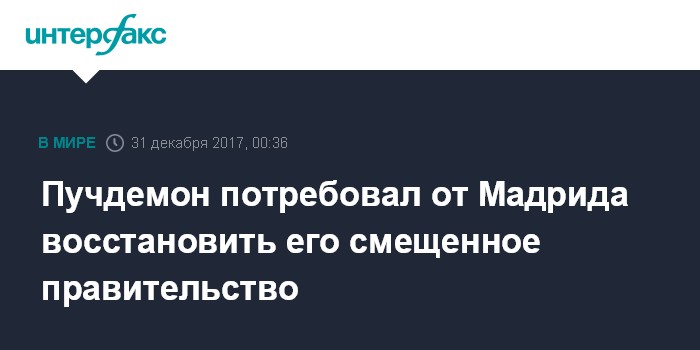 Москва. 31 декабря. INTERFAX.RU - Каталонский политик Карлес Пучдемон в своих новогодних "пожеланиях народу Каталонии" потребовал от Испании "политических переговоров" и "восстановления Мадридом правительства" региона, отстраненного от власти после "провозглашения независимости" 27 октября.
