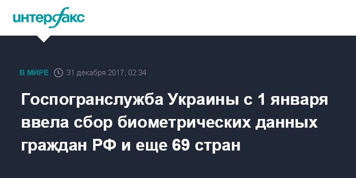 Москва. 31 декабря. INTERFAX.RU - Государственная пограничная служба Украины с 1 января 2018 года вводит фиксацию биометрических данных иностранцев и лиц без гражданства из 70 государств, в том числе из Российской Федерации.