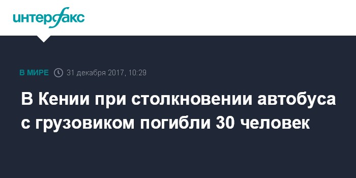 Москва. 31 декабря. INTERFAX.RU - В воскресенье утром в результате столкновения автобуса с грузовиком в районе города Накуру в центральной части Кении 30 человек погибли и 16 получили травмы, сообщают западные СМИ.