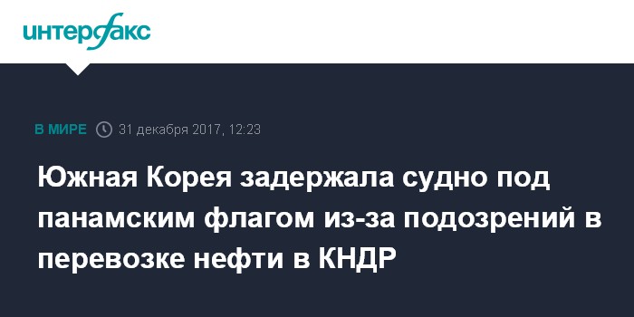 Москва. 31 декабря. INTERFAX.RU - Власти Южной Кореи задержали ходившее под флагом Панамы грузовое судно KOTI в связи с подозрениями в том, что на нем доставлялась нефть в КНДР, сообщает в воскресенье южнокорейский телеканал YTN.